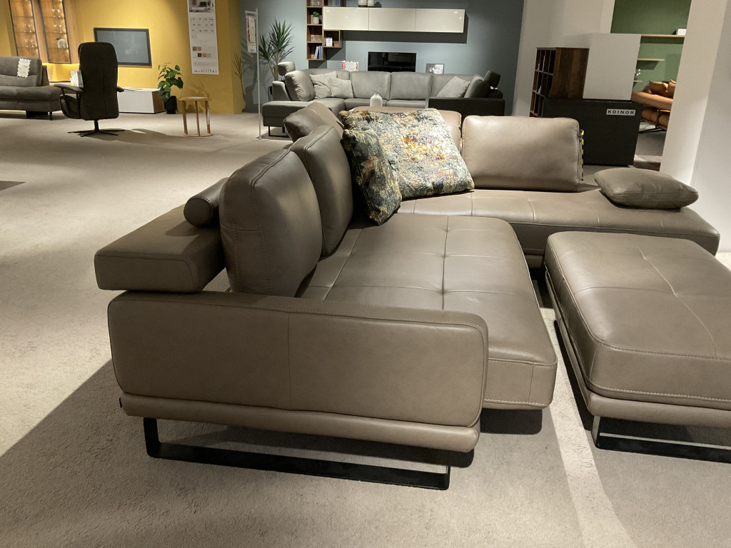 Bezug: Leder Rodeo macciatoFüße: Metallkufe schwarzca. 282 x 235 cmFunktion: - Sitzvorzug motorischZubehör:- Hocker XL ca. 122 x 68 cm - Funktions-Rückenkissen ca. 72 x 53 cm- Kissen