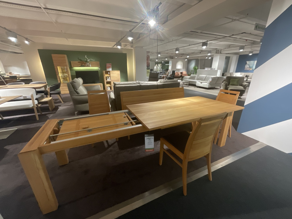 AuszugstischHolz: Rotkernbuche massivInkl. Verlängerungsplatte 80cmmit Gestellauszugca. 170 ( 250 ) x 76 x 95cmBank Holz: Rotkernbuche massivBezug: Leder dunkelbraunca. 170cm 4 x StuhlHolz: Rotkernbuche massivBezug: Leder dunkelbraun