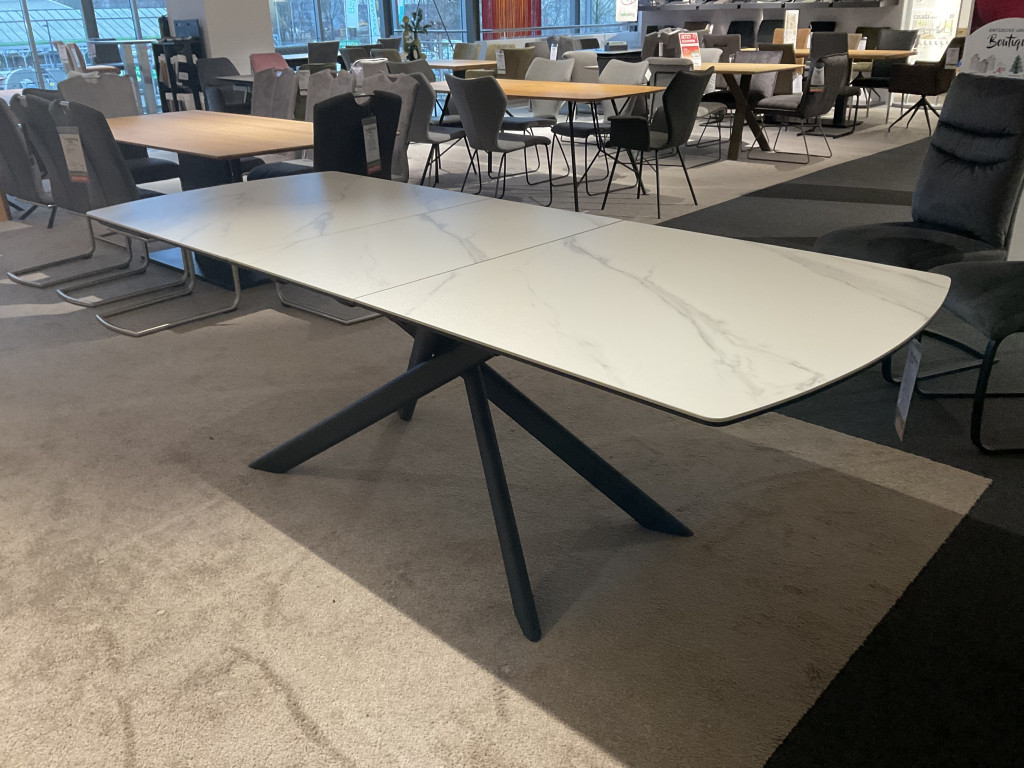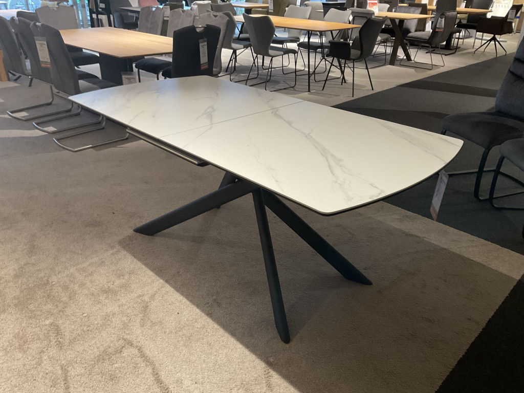 AuszugstischPlatte: Keramik weiss marmoriertGestell: Metall schwarz mattinkl. Synchronauszug / Einlegeplatte mit Liftfunktionca. 180 ( 230 ) x 76 x 90 cm4 x Freischwinger Bezug: Stoff anthrazitGestell: Metall schwarz mattBelastbar bis 120kg