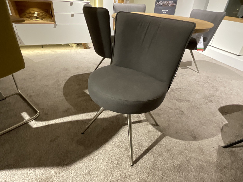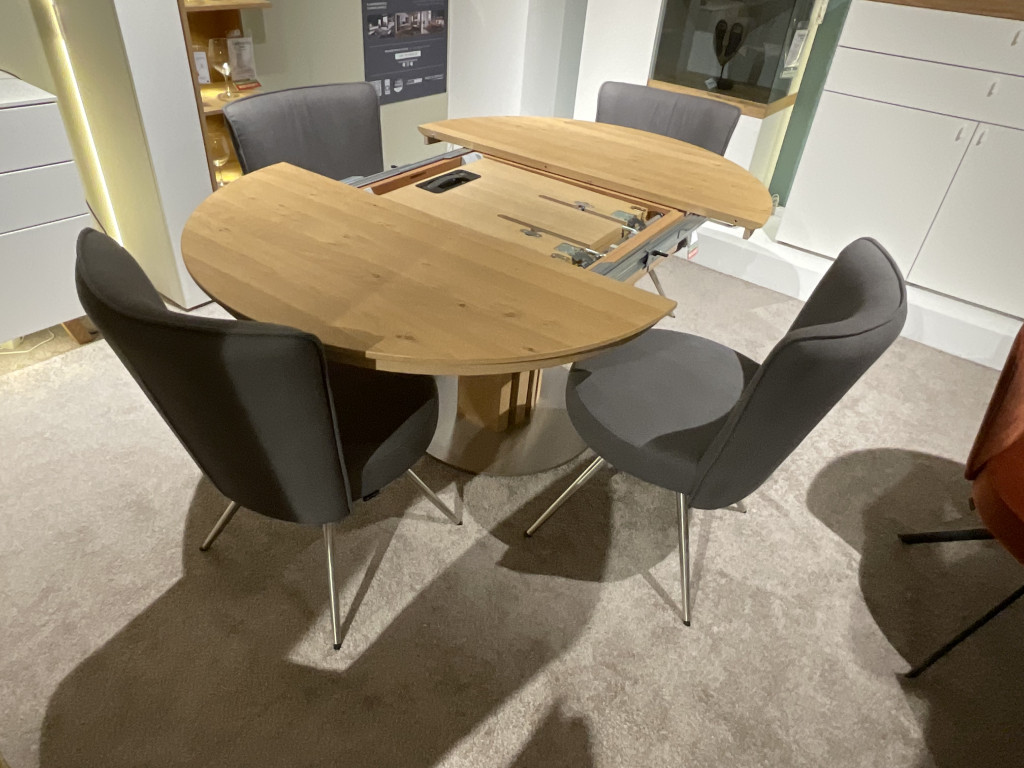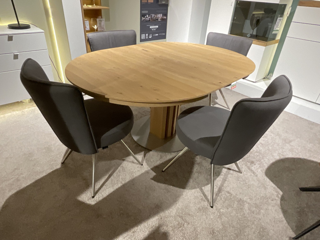 EsstischPlatte: Wildeiche hell geölt Bodenplatte: Edelstahloptikinkl. Klappeinlage 50 cmca. ∅ 120 ( 170 ) x 75 cm 4 x Stuhl Bezug: Stoff anthrazitGestell: EdelstahloptikInkl. Drehfunktion